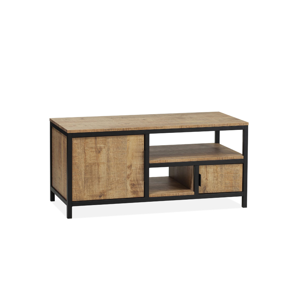 Het Bombay tv-meubel klein van Maxfurn is dé stoere sfeermaker die jouw woonkamer in één klap karakter geeft. Gemaakt van Lamulux, een duurzaam en krasvast materiaal met de uitstraling van hout. Verkrijgbaar in drie praktische maten 106, 136 en 180 cm. past hij moeiteloos in zowel een knusse zithoek als een ruime living. De warme houtlook en industriële accenten maken van Bombay een meubel met een eigen verhaal. Verkrijgbaar in de kleuren Mango, Mokka, Old teak en Oriënt. Zijn slimme opbergruimte laat snoeren en gadgets verdwijnen alsof het magie is. Jouw televisie staat er trots op, stevig en stijlvol zoals je het graag ziet. De drie formaten bieden voor elk huis en elke filmfanaat de perfecte match. Bombay is niet zomaar een tv-meubel, hij is het startpunt van elke gezellige avond.